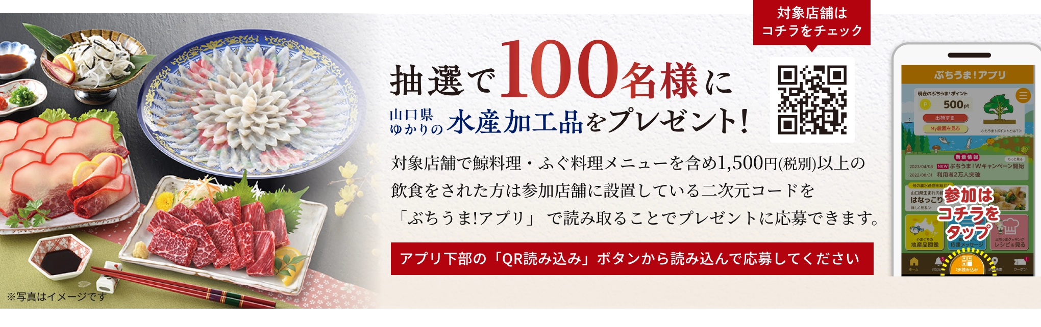 対象店舗でくじら料理・ふぐ料理メニューを含め1,500円(税別)以上の飲食をされた方は参加店舗に設置している二次元コードを「ぶちうま!アプリで」読み取ることでプレゼントに応募できます。